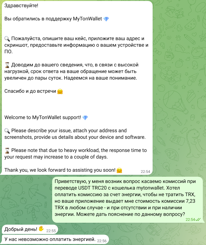 После увиденного остается 2 варианта – либо в кошельке произошла какая-то ошибка, из-за которой стоимость не пересчиталась, либо MyTonWallet попросту не имеет возможности оплаты комиссии за счет энергии. Мы пошли дальше и решили написать в поддержку сервиса через Telegram с вопросом касаемо использования энергии для оплаты комиссий, и получили следующий ответ: