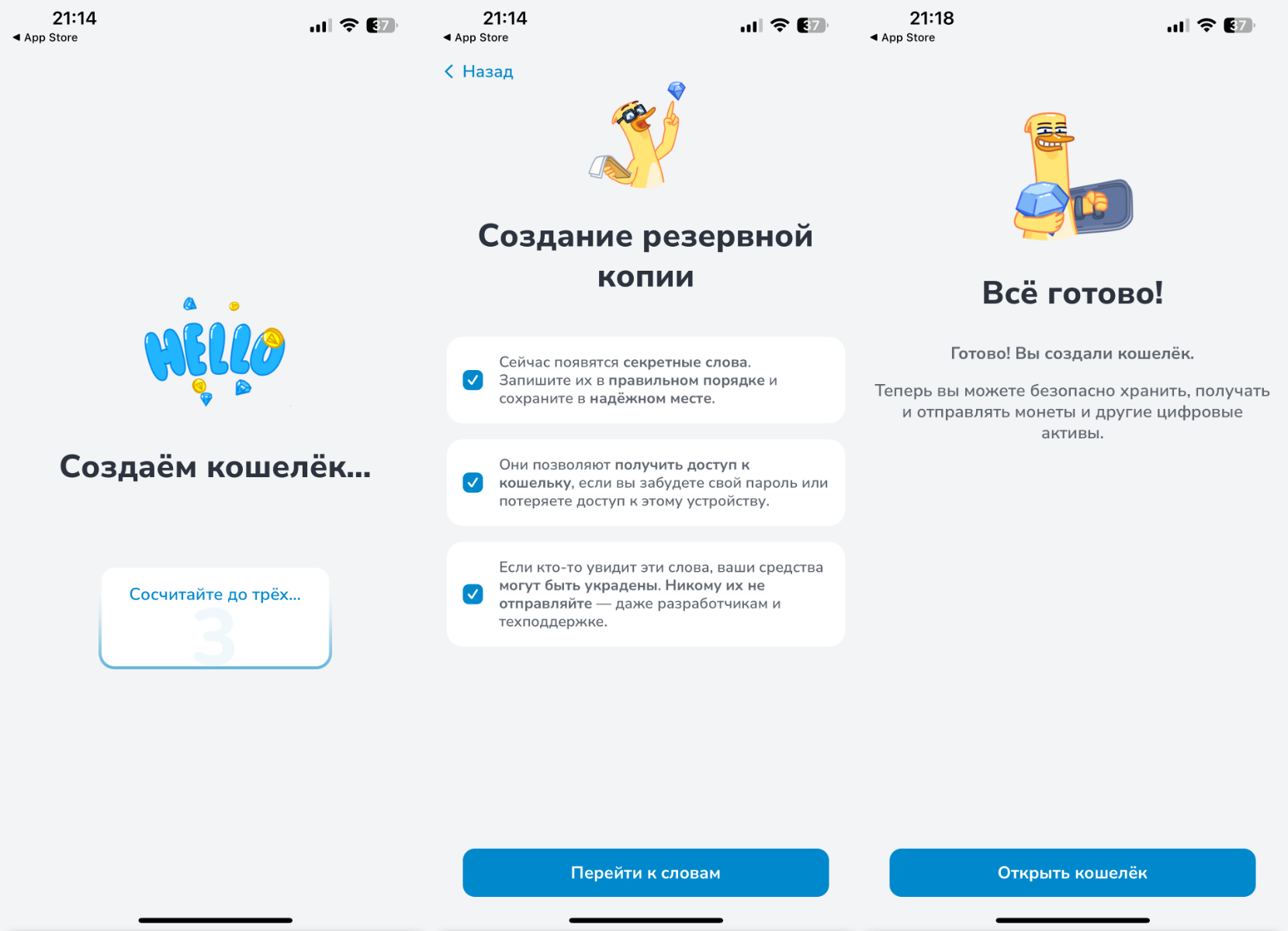 5. Затем на вашем экране появится seed-фраза из 24 слов, которую нужно записать и хранить в надежном месте. Эта фраза – единственный способ восстановить доступ к кошельку при потере устройства или пароля. С точки зрения безопасности рекомендуем написать seed-фразу на бумаге и хранить в надежном месте. Далее пройдите подтверждение (ввод 3 слов из seed-фразы).