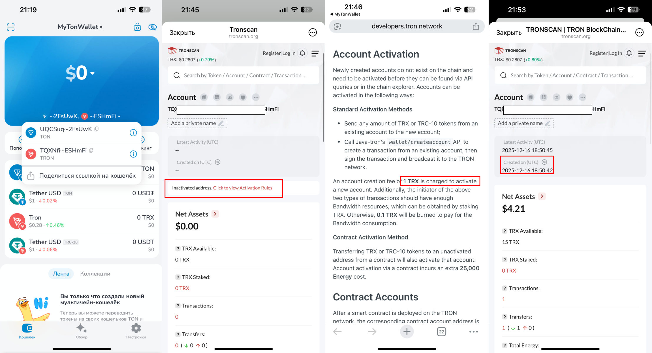 Так как мы рассматриваем транзакции TRC-20, то для полноценного пользования кошельком нам потребуется его активировать. То, что кошелек неактивирован, вы сможете увидеть в Tronscan, если нажмете на свой адрес. Для активации кошелька достаточно пополнить адрес на не менее чем 1 TRX. Это вы можете сделать либо с уже существующего у вас другого кошелька (Trust Wallet, Exodus, SafePal и др.), либо с биржи (Bybit, Binance).