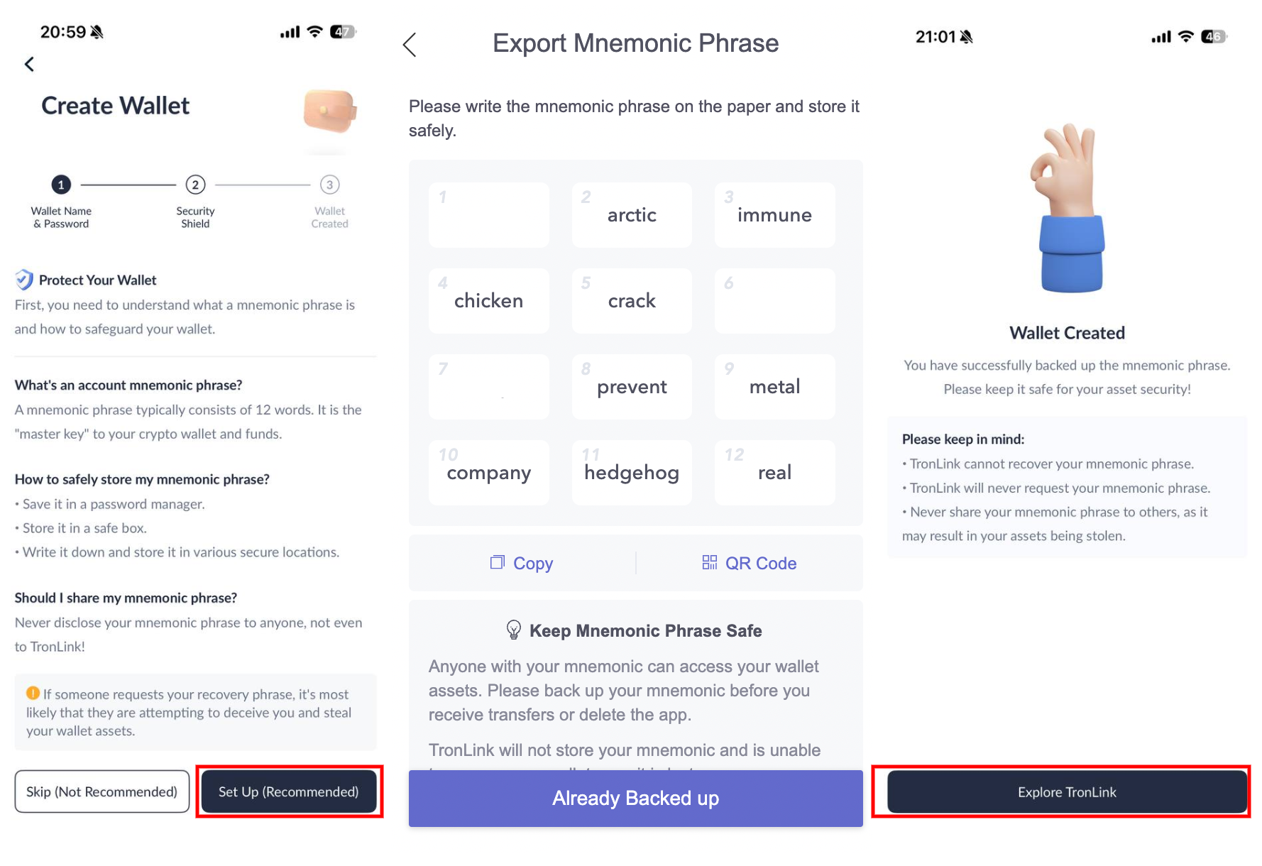 TronLink покажет seed-фразу и попросит подтвердить, что вы ее сохранили, проверив порядок слов.