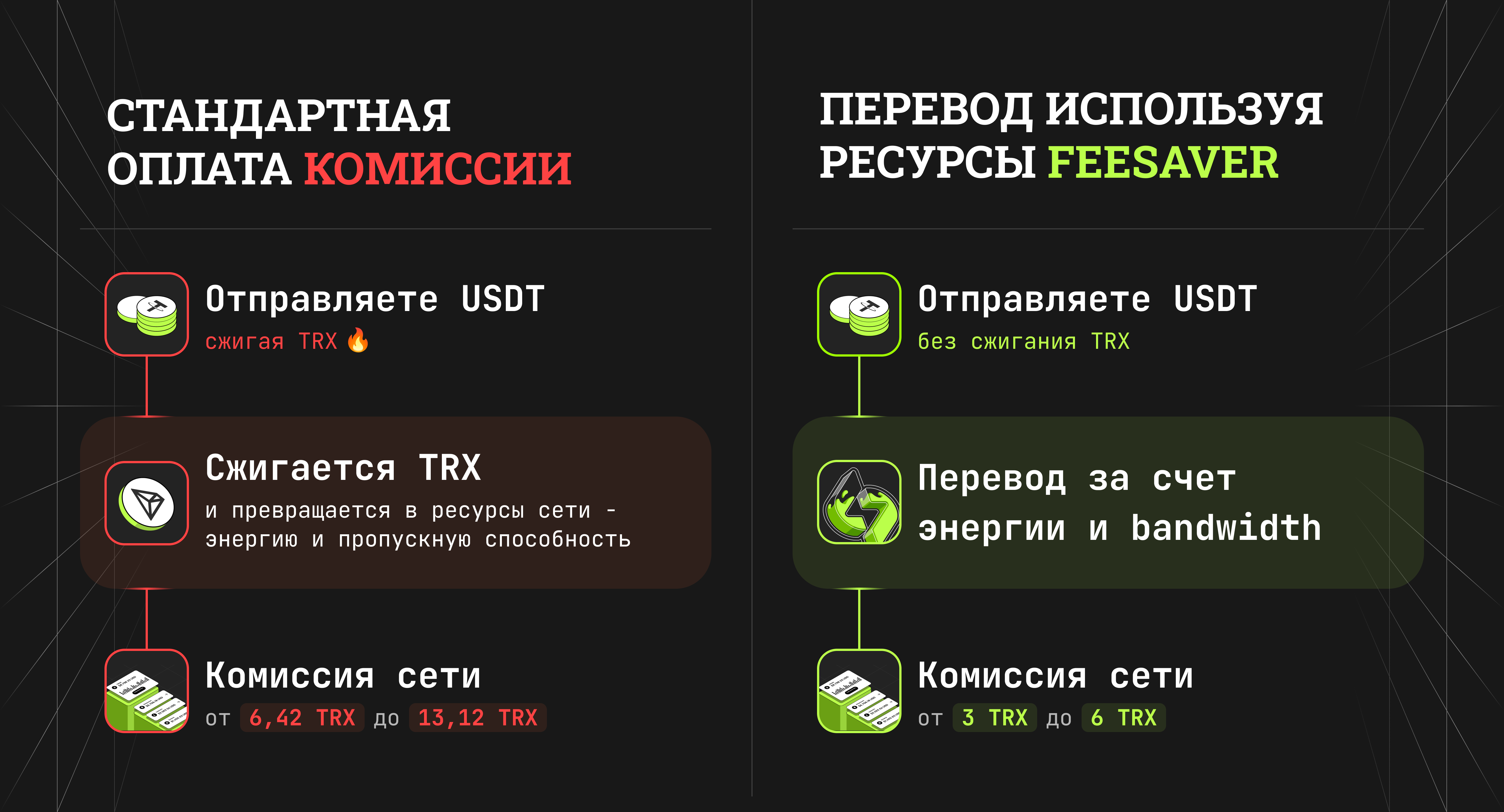 - при использовании FeeSaver средняя комиссия за ту же транзакцию составляет примерно 2–5 TRX (около 0.50–1.50 USD).