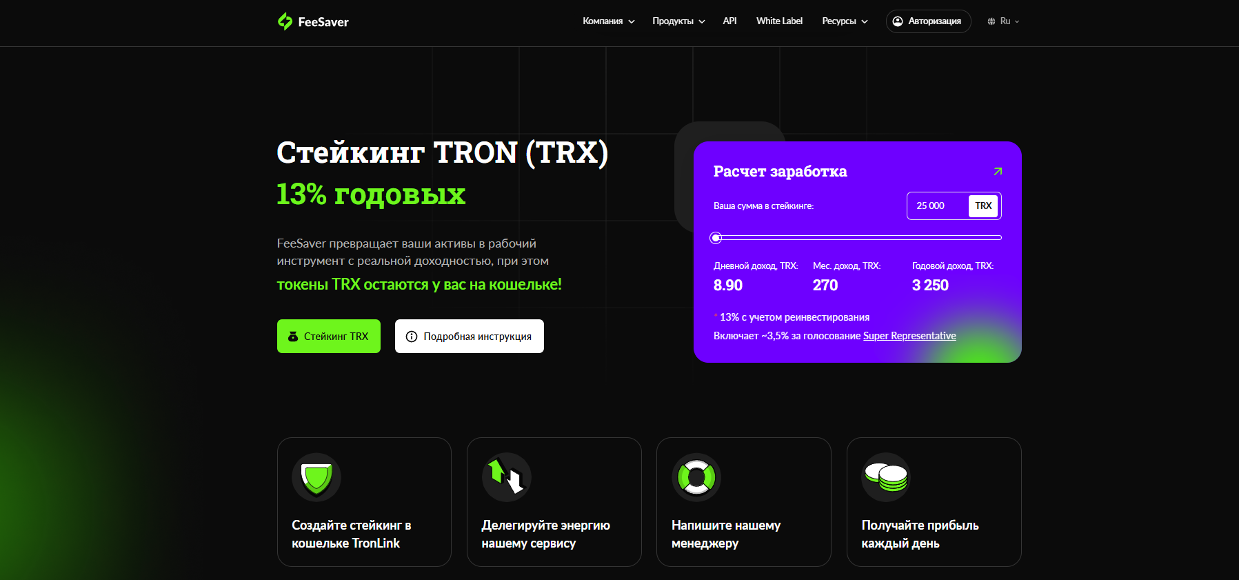 - Сервисы аренды энергии (FeeSaver и аналоги, ончейн): Наибольшую доходность предлагают сервисы, которые специализируются на аренде энергии Tron. FeeSaver – один из таких сервисов – заявляет доходность до 13% годовых (с учётом реинвестирования) при стейкинге TRX. По сути, это состоит из ~3,5% базовых наград Tron плюс ~9-10% дополнительного дохода от продажи вашей энергии другим пользователям.