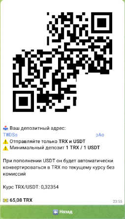 3. Бот сгенерирует QR-код и адрес для пополнения.