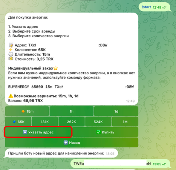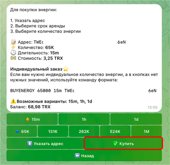 5. После того, как баланс пополнен, можно приступать к покупке энергии. В меню нажмите “Купить энергию”, после чего бот запросит адрес вашего кошелька, срок аренды и количество энергии.