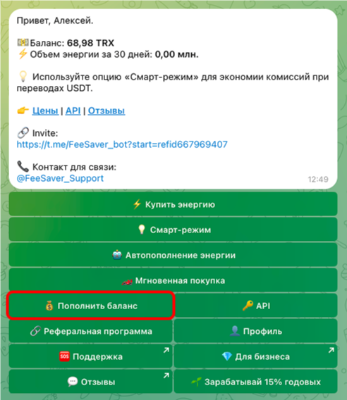 Бот FeeSaver – удобный инструмент для пользователей Tron, которым нужна энергия без покупки TRX и заморозки активов. Он упрощает переводы USDT TRC-20, и снижает постоянные расходы на комиссии. Благодаря этому инструменту работа с USDT TRC-20 становится быстрее, дешевле и удобнее.