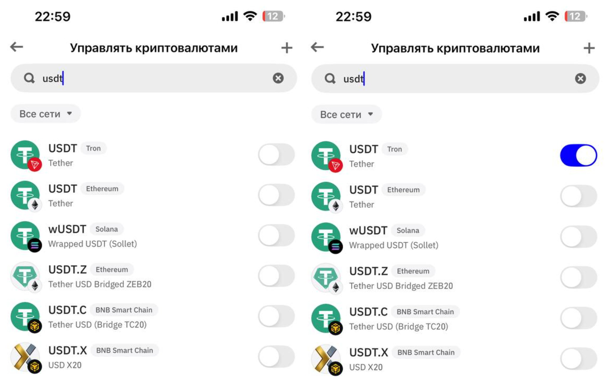 - Activate the toggle on the right next to USDT - TRON (TRC-20).