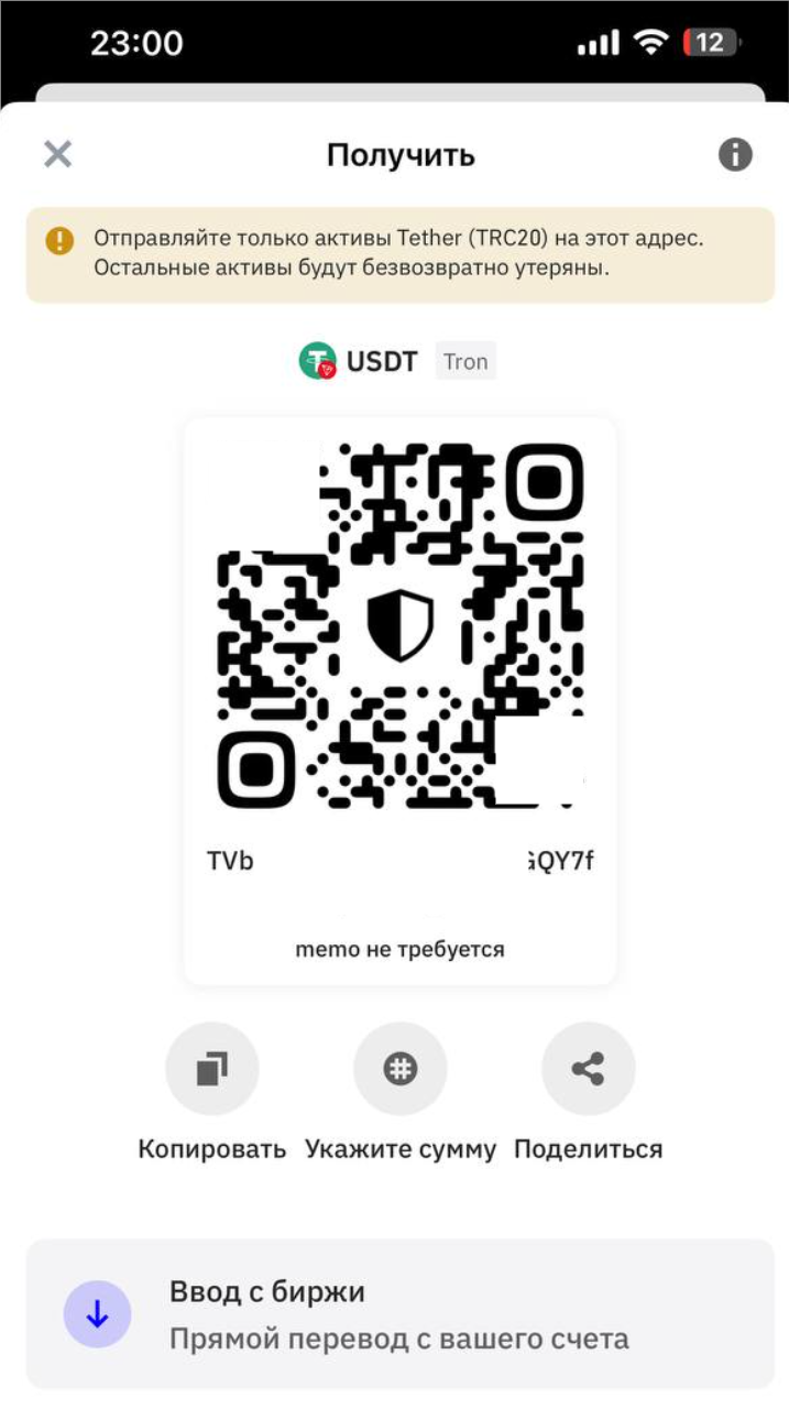 - Then, to check, open USDT from the assets list. In the lower corner of the screen select the “Receive” button, after which you will see your deposit address on the TRON network. Trust Wallet will once again remind you that TRC-20 assets must be sent only to this address; otherwise you risk losing assets. On an exchange or in an exchanger, always choose the TRON/TRC-20 network when withdrawing.