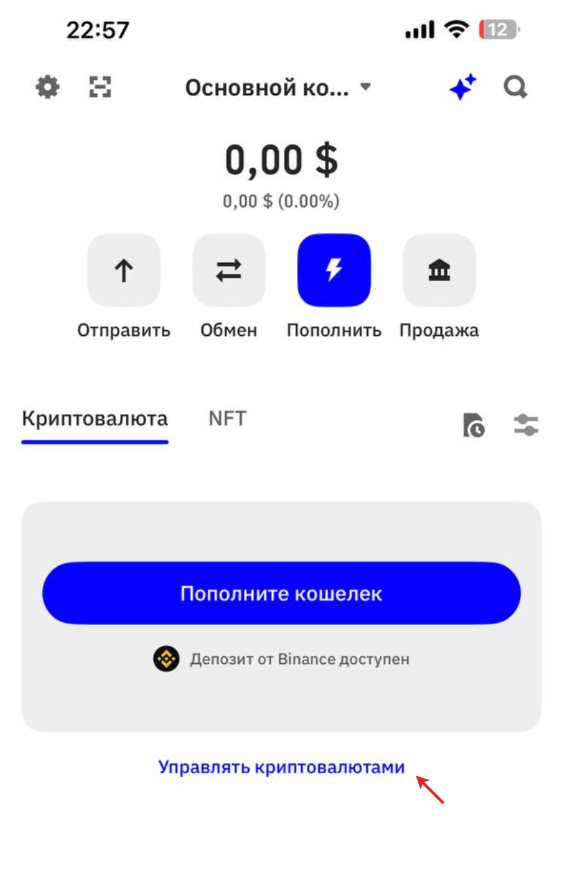 Step 1. Open Trust Wallet and on the main screen tap “Manage cryptocurrencies”, after which the token list management window will open.