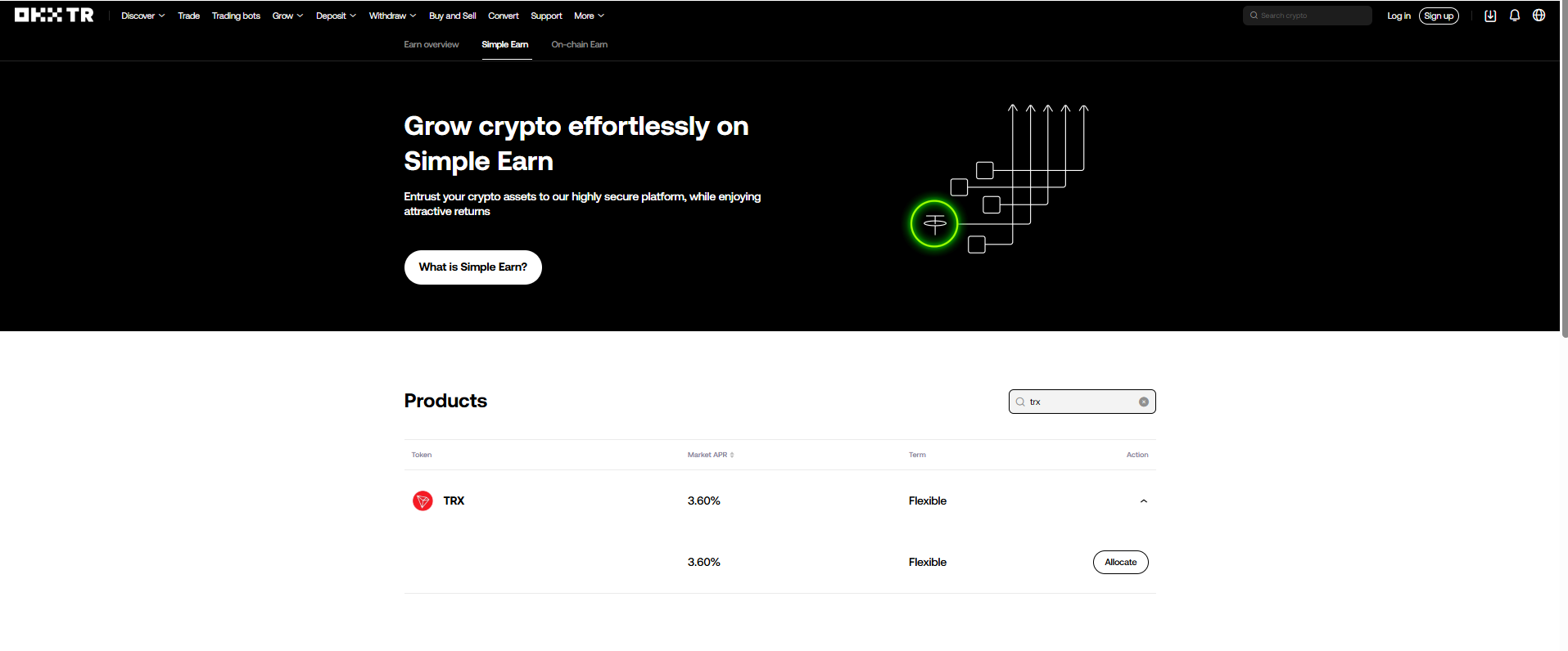 Major exchanges offer TRX staking or savings products, typically ~3–6% APR. Examples include up to ~5% APR on Kraken, and similar figures on OKX and Binance. Promotions may briefly raise rates, but averages remain below the top alternatives.