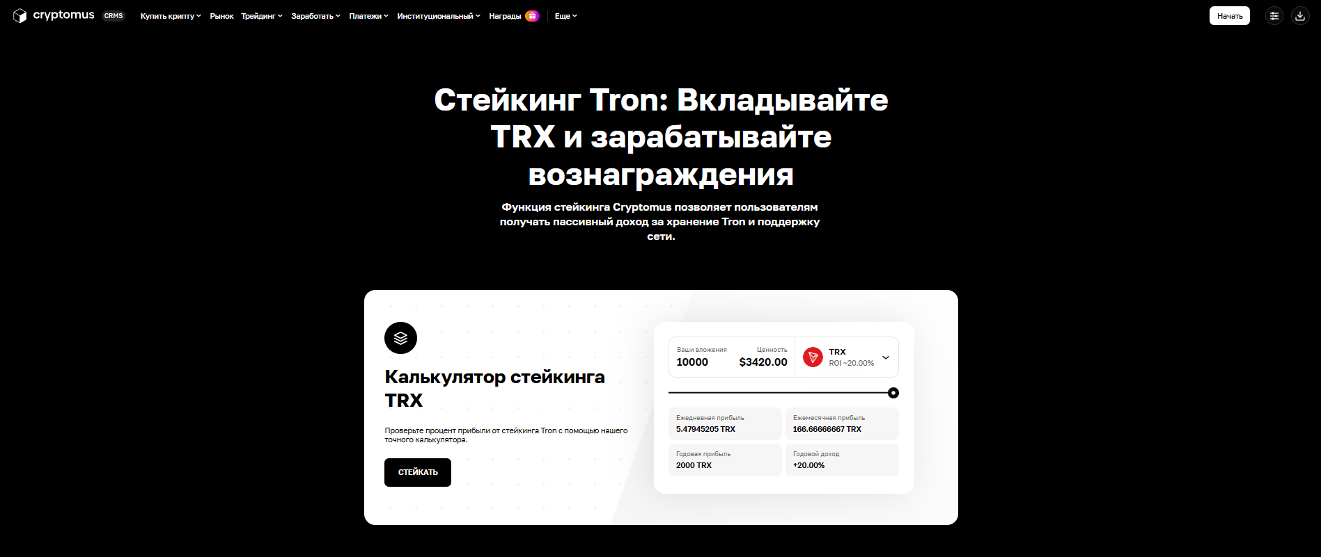 Platforms advertise higher rates by combining custodial convenience with on-chain delegation. Cryptomus markets up to ~20% APR by staking users’ TRX (you can even choose a validator—default often shown as BinanceStaking). In practice, reaching 20% usually requires meeting conditions such as locking TRX for ≥365 days, choosing an optimal validator, avoiding early withdrawals, etc. Maximum rates assume long lockups and strict settings.
