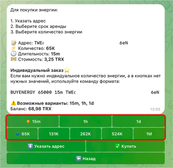 5. After topping up, select “Buy Energy.” The bot will ask for your wallet address, rental period, and the desired amount of energy.