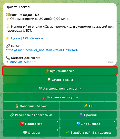 The bot makes it easy to get energy without diving into technical details. Available features include: